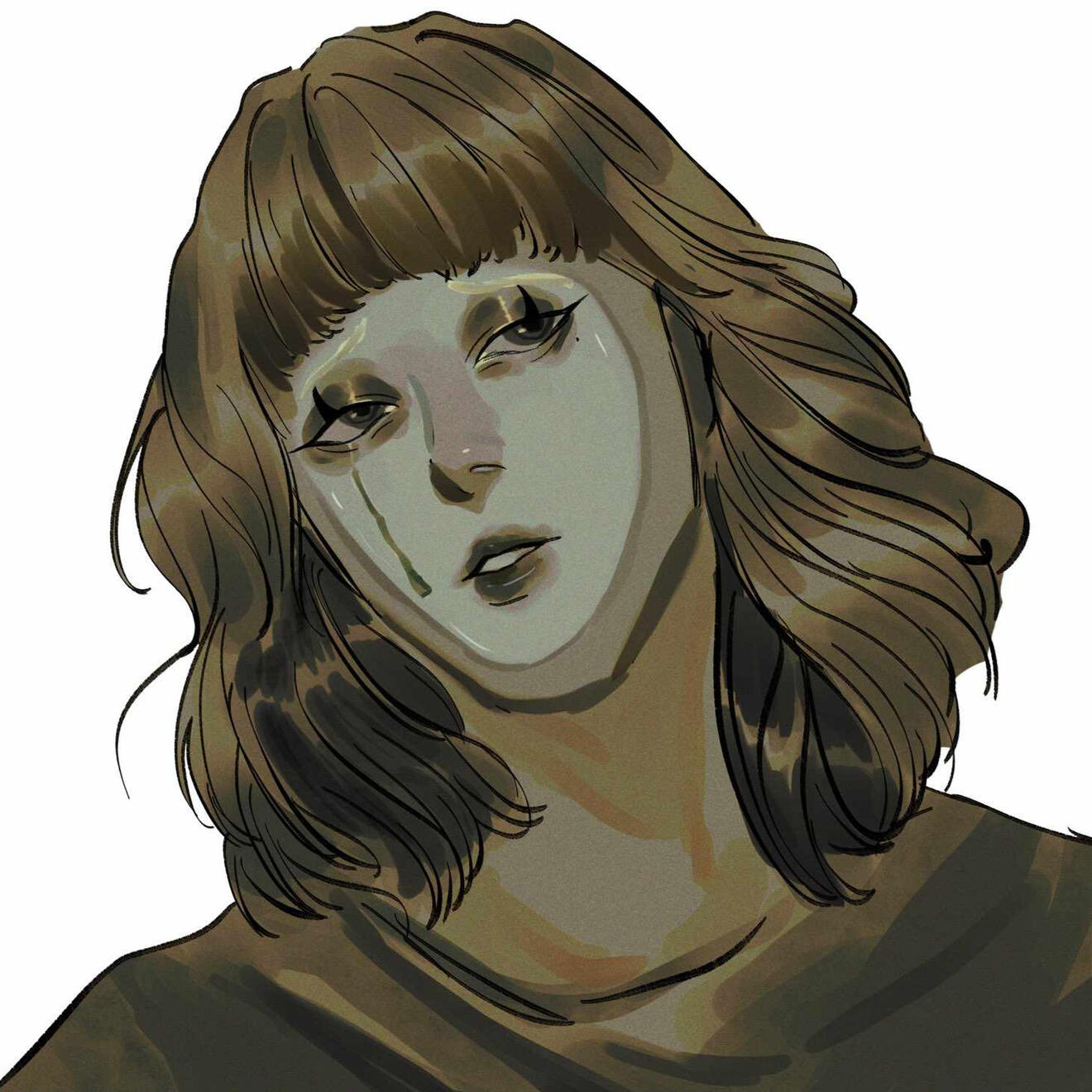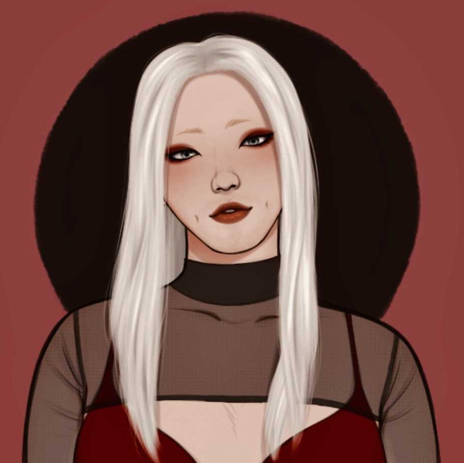 Her thick, dark hair falls to just above her shoulders in numerous layers; her bangs are cut bluntly across her forehead, falling just beneath her eyebrows and above her eyes. Her skin is a clear honey tone with subtle red undertones, though it holds a few beauty marks. One above her right eyebrow, one beneath her right eye, and one beneath her left eye. Her eyes are an even jade, holding an amber tone around the pupil.She enjoys wearing makeup; large lashes paired with dark eyeliner, a pop of color in the form of eye shadow or a bright, bold lip. She doesn't wear blush often, claiming that it makes her look too flushed. Due to being a part of the Buggy Pirates currently, she often wears clown makeup reminiscent of what would be considered 1920’s makeup trends in that: